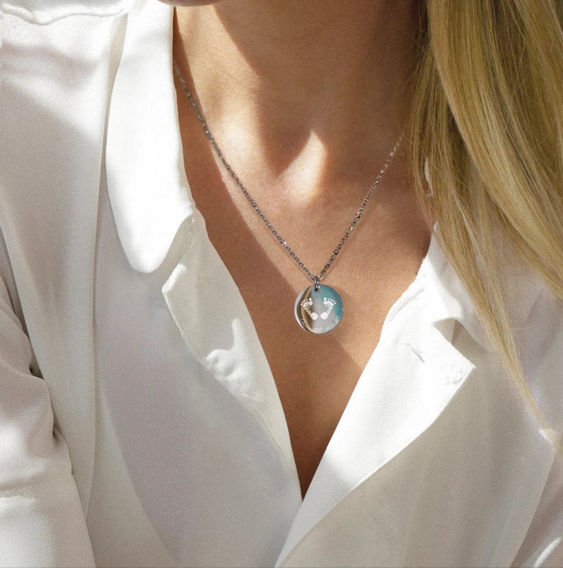 Stainless Steel Handprint Pendant - Baby Footprint Jewelry - Personalized Memorial Gift - Swarovski Crystal Birthstone Charm