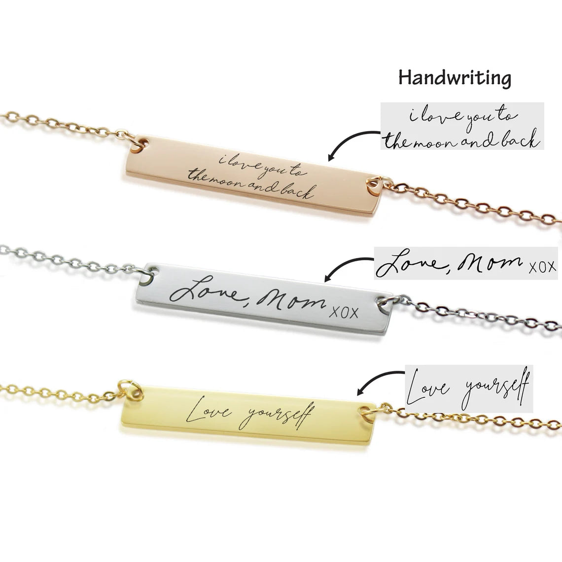 Stainless Steel Silver Gold Rose - Engraved Handwriting Bar Necklace - Custom Signature Jewelry - Memorial Gift
